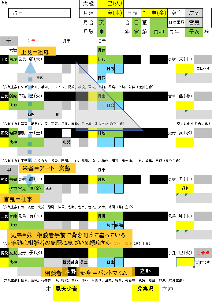 隣接する2爻に兄弟の寅が居ます。居間の手前に相談者に背を向けて座っている妹の様子。そして上爻を祖母と見ます。初爻、二爻に対して最も遠い位置にありますから向こう正面に座っています。