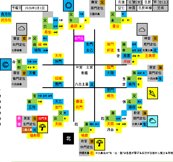 北☂️、北東☂️…北西⛅に方位除けが可能です。吉方位に移動後、現地への移動が東🌤となるように調整して方位除けを行いましょう。北西は吉意が弱いので滞在時間は長めに、現地への移動は吉刻を利用するとよいでしょう。