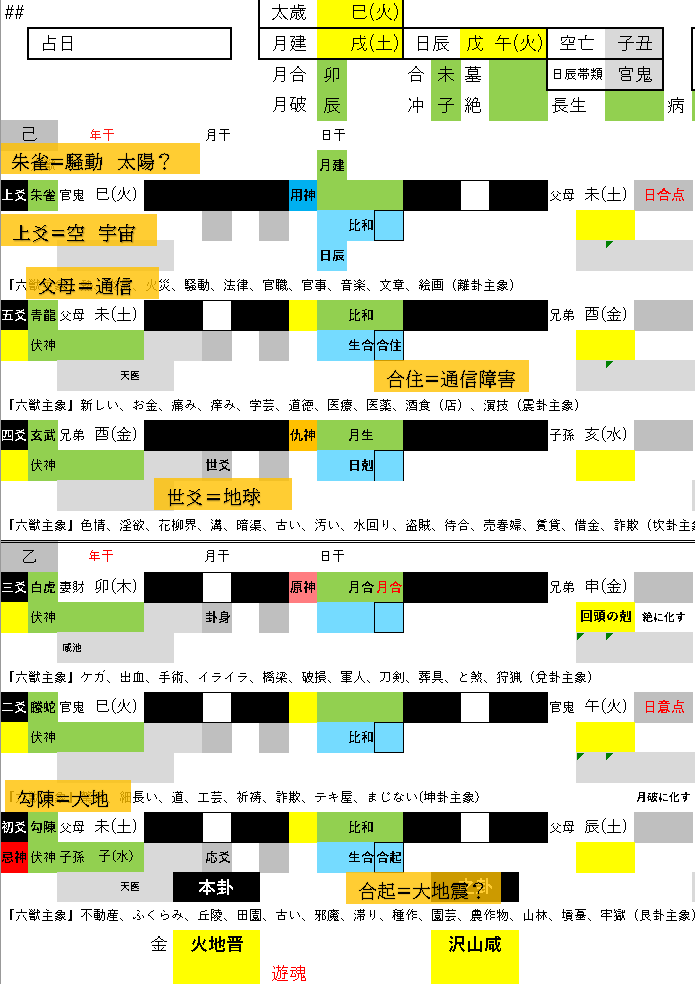 日辰は午でこの父母の未を合します。初爻は合起。初爻に勾陳が付帯、勾陳は大地の象意があり、日辰に合起とは、彗星の接近、あるいは太陽から発する磁気嵐が地球の地殻変動を促し、大地震を発生させるのでしょうか?