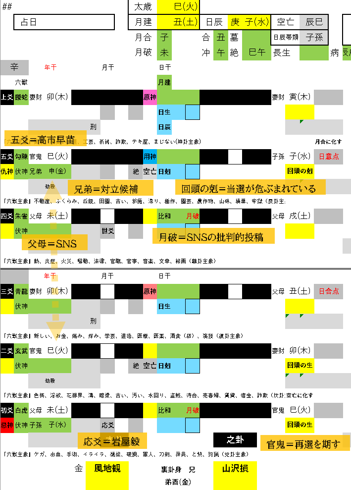 応爻が岩屋候補。発動して用神を化出の回頭の剋は再選を期して選挙戦を戦う覚悟を示します。ただし往古は月破、月建の丑は父母を帯びこれにはSNSという意味があるので、SNS上で岩屋批判が炎上している様子。また、発動先の巳(火)は空亡の空亡化ですから、支持は伸びないでしょう。