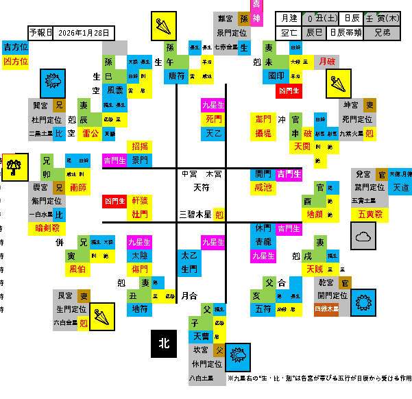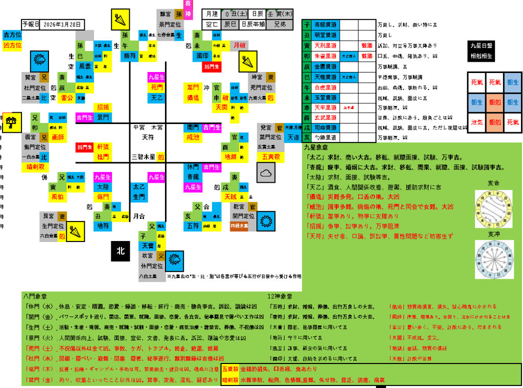 九紫火星…本命星は坤宮(土)に泄氣、坤宮は日辰から剋を受け日破が重なるので運氣低迷の衰運日です。貴重品の紛失や忘れ物に注意しましょう。人間関係ではコミュニケーションがうまく測れません。つまらないことで感情的になって、周囲と対立しそうです