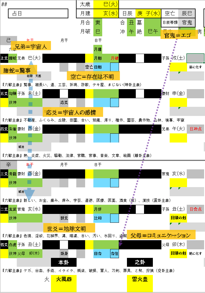 その初爻の子孫は父母を化出、父母にはコミュニケーションという意味があり、宇宙人とのコミュニケーションを求めている…つまり閉塞状態の打開を宇宙人に求めている感じです。