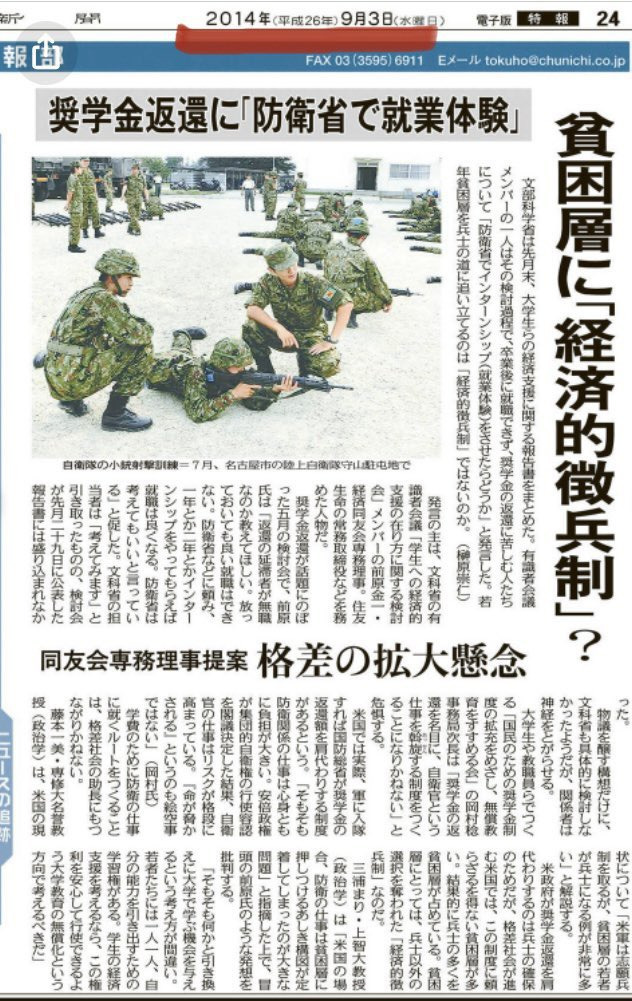 自衛隊入隊を引き換えに大学の奨学金を免除する…という制度設計を今から2年以上前に経済同友会は政府に提言しています。