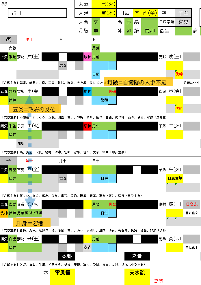 占断としては、官鬼は発動し、原神となる妻財も発動を見ます。一方で忌神となる子孫は発動を観ませんから、何らかの形で徴兵制度に近い精度で、政府は自衛隊の太陰不足解消を図る制度を導入するでしょう