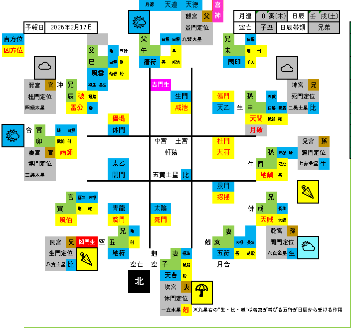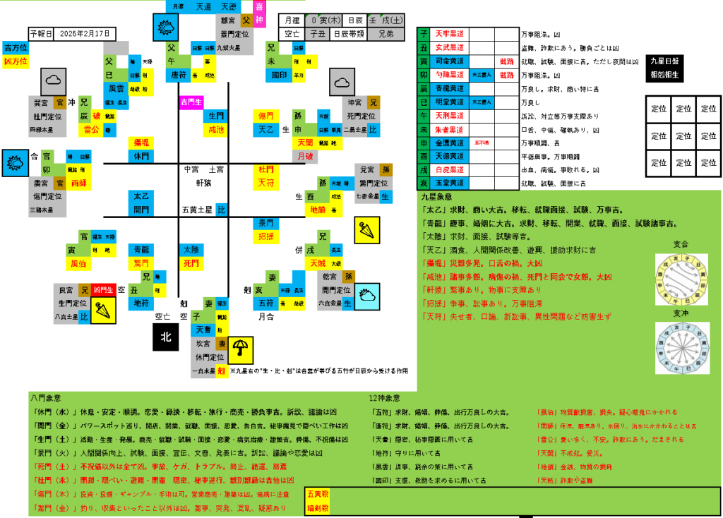 17日は五黄中宮日で大きく崩れる本命星はありません。ただし一白水星は坎宮(水)が日辰から剋を受けるのでご注意ください。