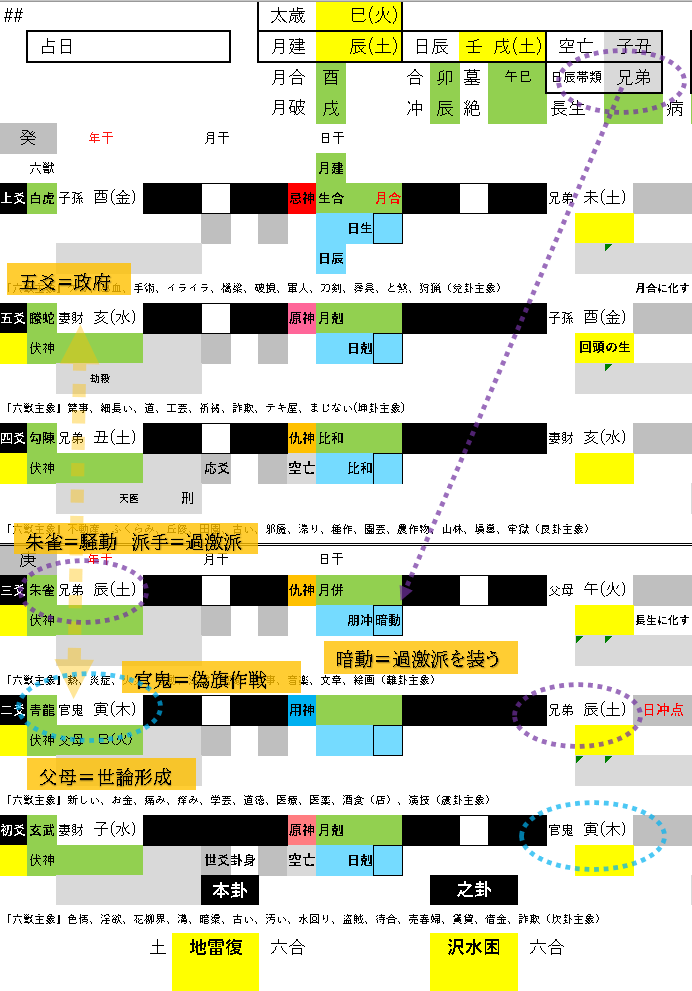 五爻を政府の爻位と見ると、この発動する官鬼と合の関係。政府はテロ事件が起きると事を事前に知っています。あるいはこの事件を奇貨に憲法改正に一気に世論を誘導し、改正案可決の方向にもっていくのでしょう。