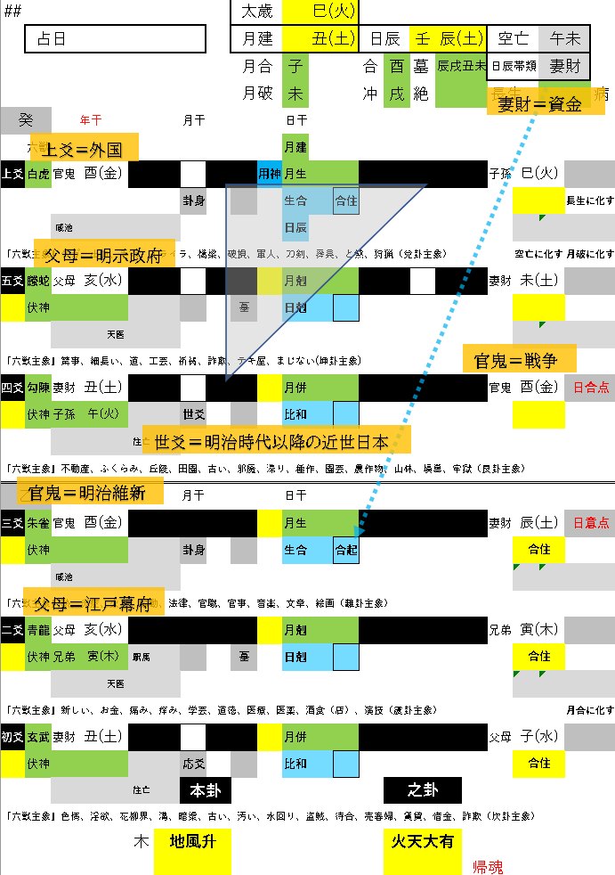 同時に世爻は官鬼に変化している。これは明治維新後の日本の様子で、官鬼は戦争。