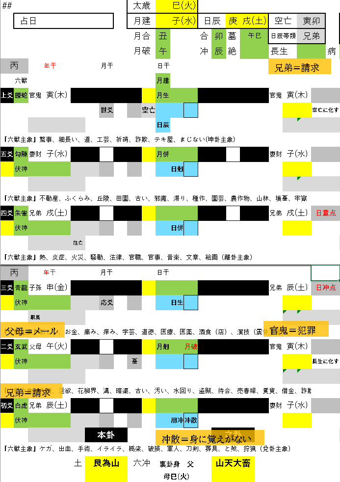 初爻の兄弟が発動し、申子辰(水局三合)の関係から応爻の申(金)、妻財の子(水)を墓に収めます。兄弟は破財星で請求、ただし戌日(土)に冲散するので身に覚えのない請求です。