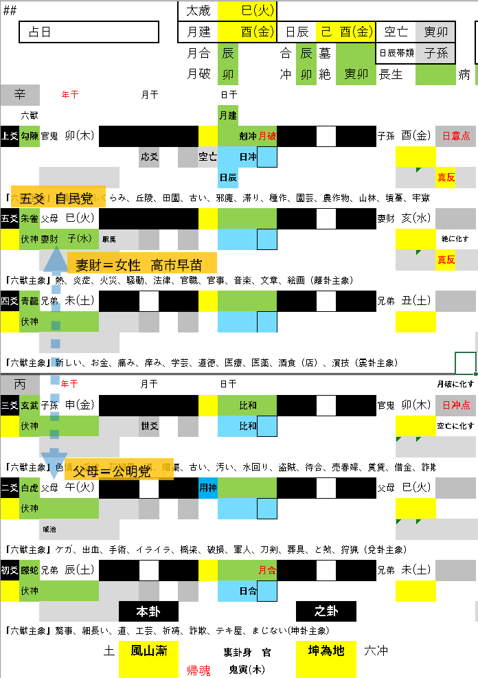 一方で初爻が合起しています。騰蛇(とうた)が付帯し、詐欺、疑念という意味から、裏金問題で処分を受けたにもかかわらず党籍に復帰、今回幹事長代行に選ばれた萩生田光一を表していそうです。