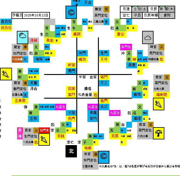 四緑木星…本命星は坤宮(土)を剋す殺氣。回座宮は日辰から剋を受け、ここに日破が重なる衰運日です。暴飲暴食で体調を崩したり、金銭面無駄遣いをして後悔する場面がありそうです。コミュニケーションでは、通信障害や会話に誤解が生じやすいのでご注意ください。