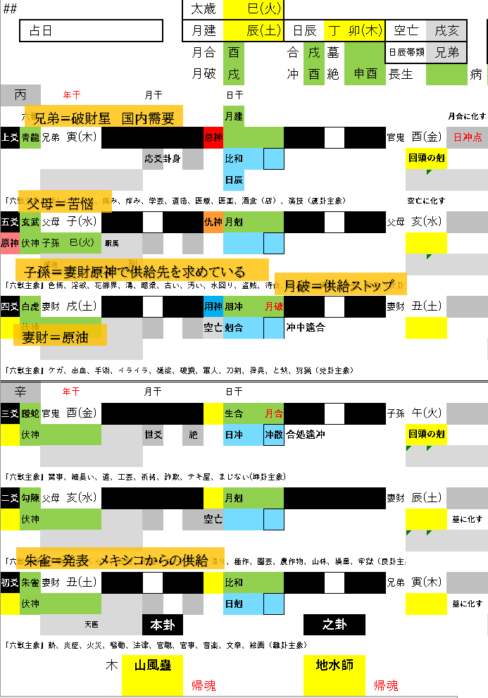 したがって四爻の妻財が中東に変わる供給先ですが、戌(土)は占日に空亡していますから見つかっていません。また辰月(土)からの月破は海外からの供給がストップしている様子です。