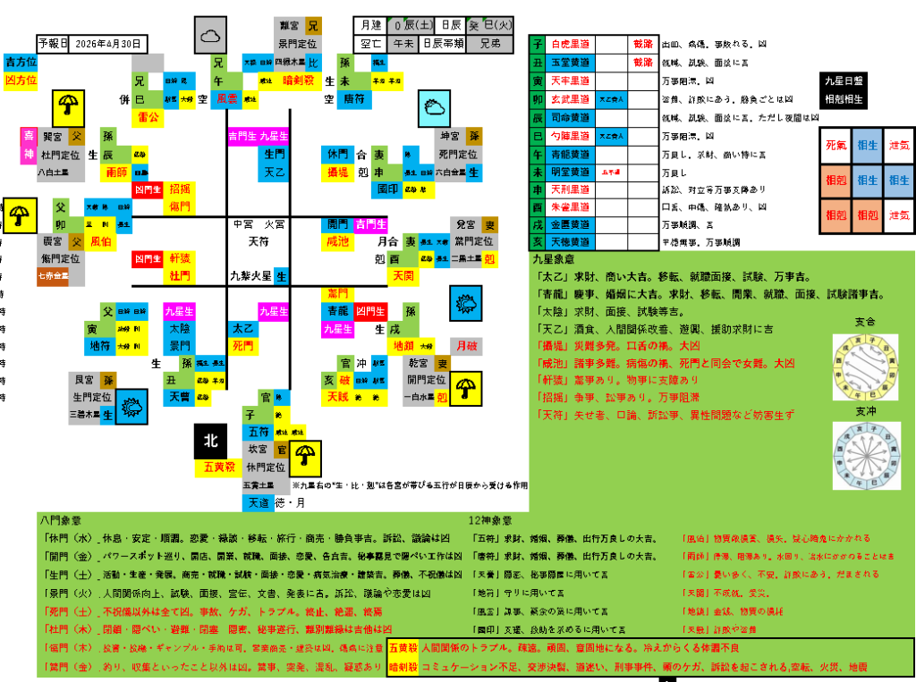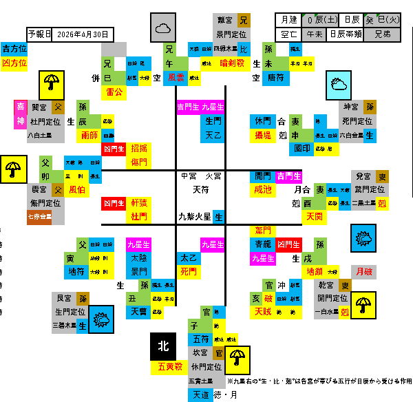 氣學日盤・時盤では、辰刻・午刻の北西、亥刻の南北凶煞重なる注意方位です。