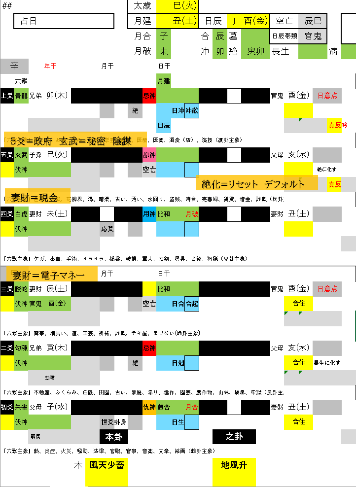 3爻には官鬼が伏神し、騰蛇(とうた)が付帯。騰蛇は蛇で細長いですから、結ぶ、繋ぐ…という意味がありますから、政府による口座の紐付けを想起させます。官鬼の酉(金)と辰(土)は合、5爻を政府の爻位とすると、巳(火)は官鬼酉(金)の長生にあたります。
