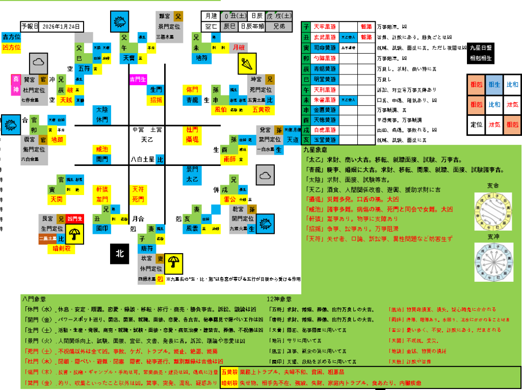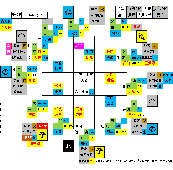 氣學・日盤及び時盤では、辰刻の北東、南西、申刻の北東、酉刻の南東に凶煞重なります。