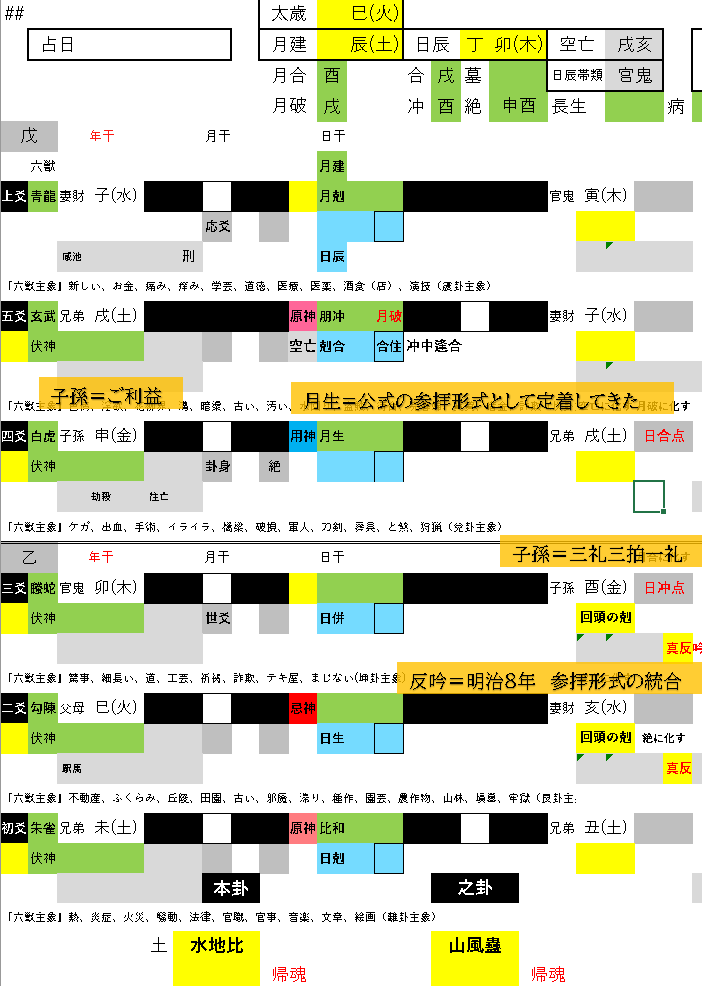 内卦が反吟しています。回頭の剋を伴う真反吟は、それまで神社ごとに参拝形式が異なっていて儀礼を統合し、諸流を俗説と廃し足様子を表します。