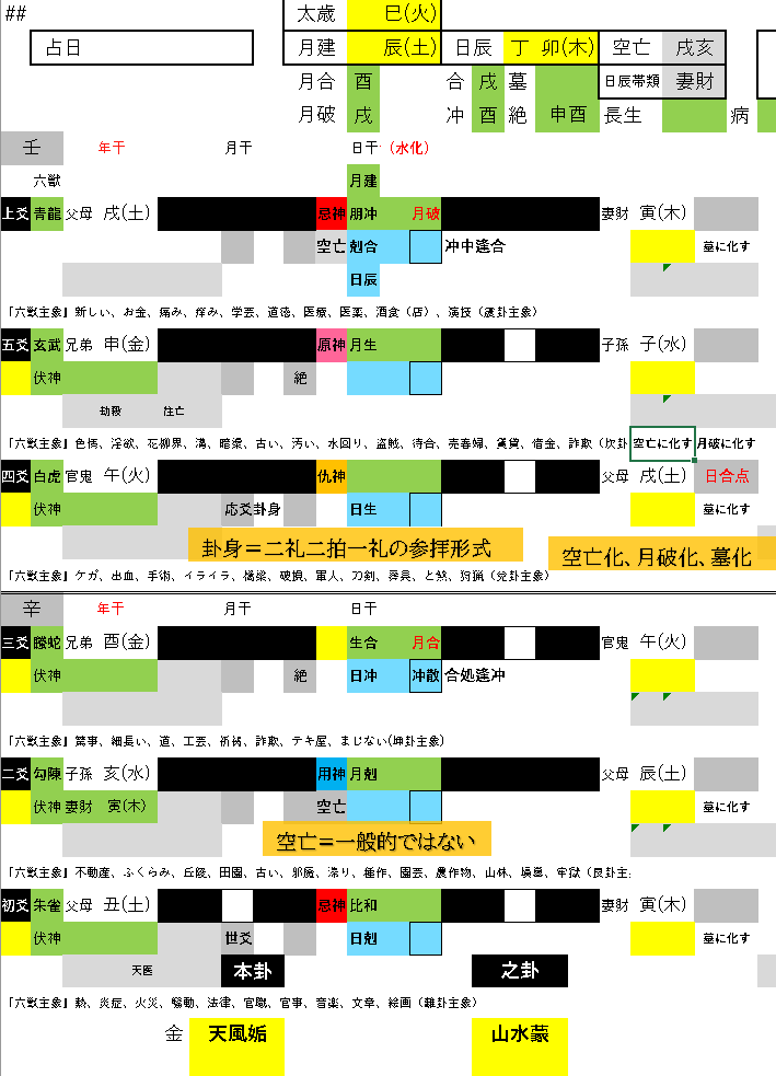 占断としては月建の生を受ける用神は原神が合住して生を受けることはできませんが、忌神は回頭の剋なのでこちらも用神は剋せません。従って吉と下すことは出来る得卦です。