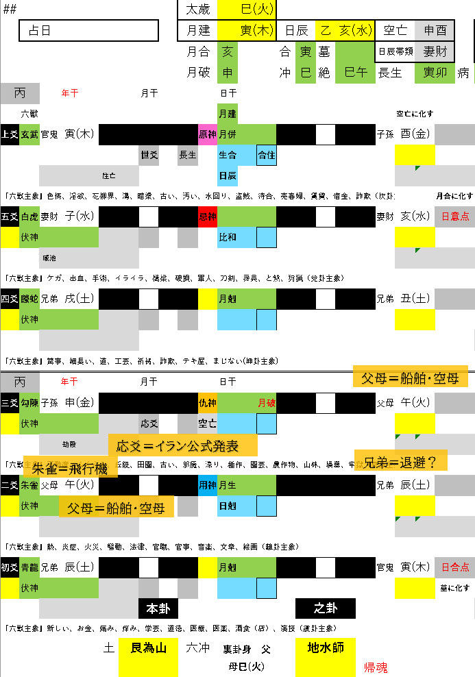 父母は2爻に現れています。応爻をイランとすると三爻が応爻を帯びましたからイラン近海で作戦に従事している様子。朱雀(すざく)を付帯、これを飛行機とすれば航空母艦という性格を強めます