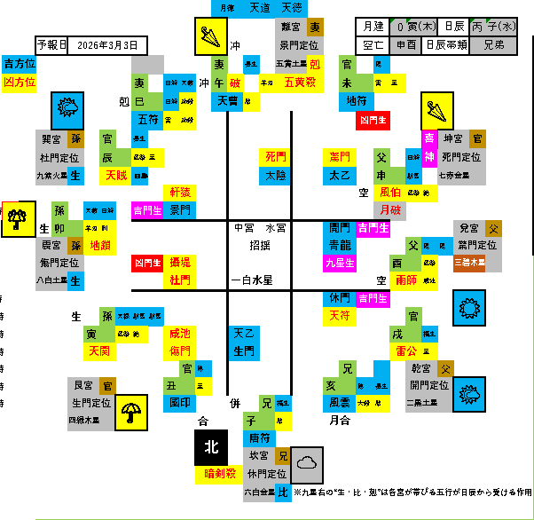 北東🌂、東☂️…効果的な方位除けが難しい一日です。最大吉方の西☀をうまく利用しましょう。吉方位で運氣を取り入れて、吉刻を利用した現地への移動をお勧めします。