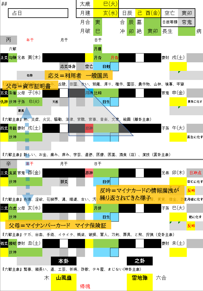このうち2爻は月併していますから、すでに運用が始まったマイナ保険証でしょう。ただし内卦が寒誾しており、これまで情報漏洩や、システムエラーが多発している様子です。