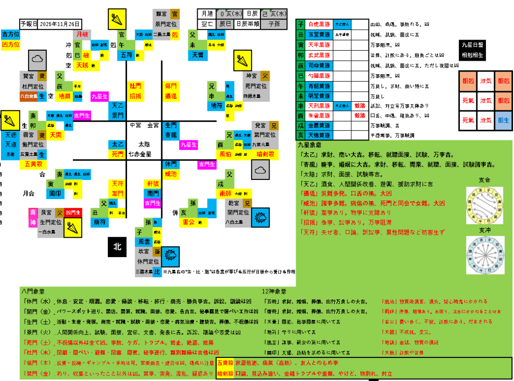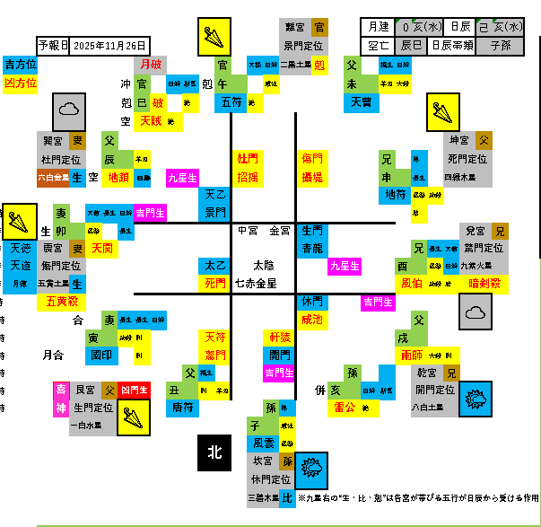 吉方位が北側に集中し、効果的な方位除けが難しい一日です。直接現地には向かわず、北🌤、北西🌤の吉運氣を取り込んで、吉刻を利用して現地入りするとよいでしょう。特に東は凶意が強いので、滞在時間は短めに切り上げましょう。