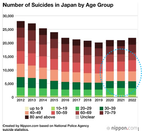 減少傾向にあった自殺者数は2020年から再び増加に転じていますが、70〜79代、80歳超の自殺者も増加に転じており、物価高、年金収入では生きてゆけない高齢者層の実情がグラフからも読み解けるところです。