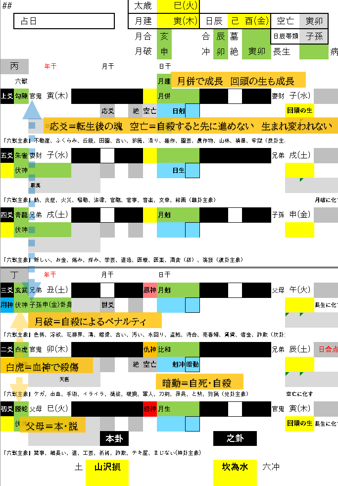 しかし、もし現世の苦しみから逃れようと自死を選んでしまうと、ちょうど三爻から二つ下の初爻に父母の巳があり、子孫の申とは合の関係、つまり2世代前まで退行してしまう…そんな様子が卦に現れています。