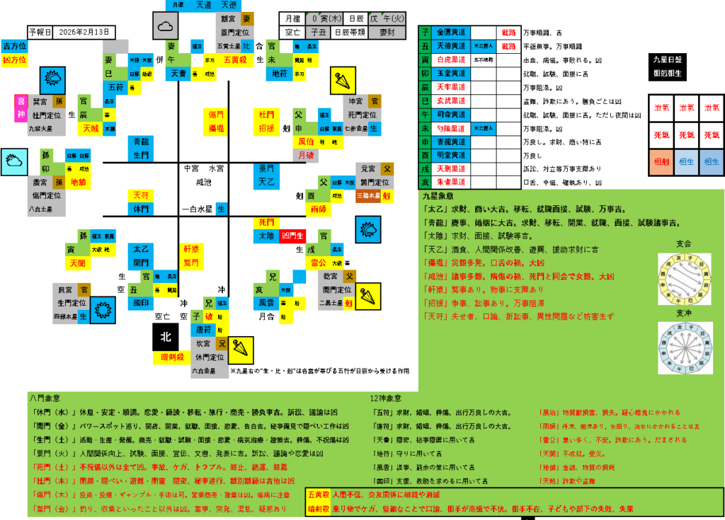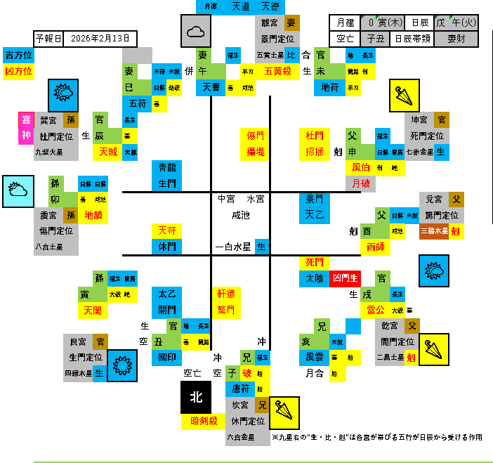 氣學・日盤及び時盤では、辰刻の北西、午刻の北、亥刻の南北に凶煞重なります。
