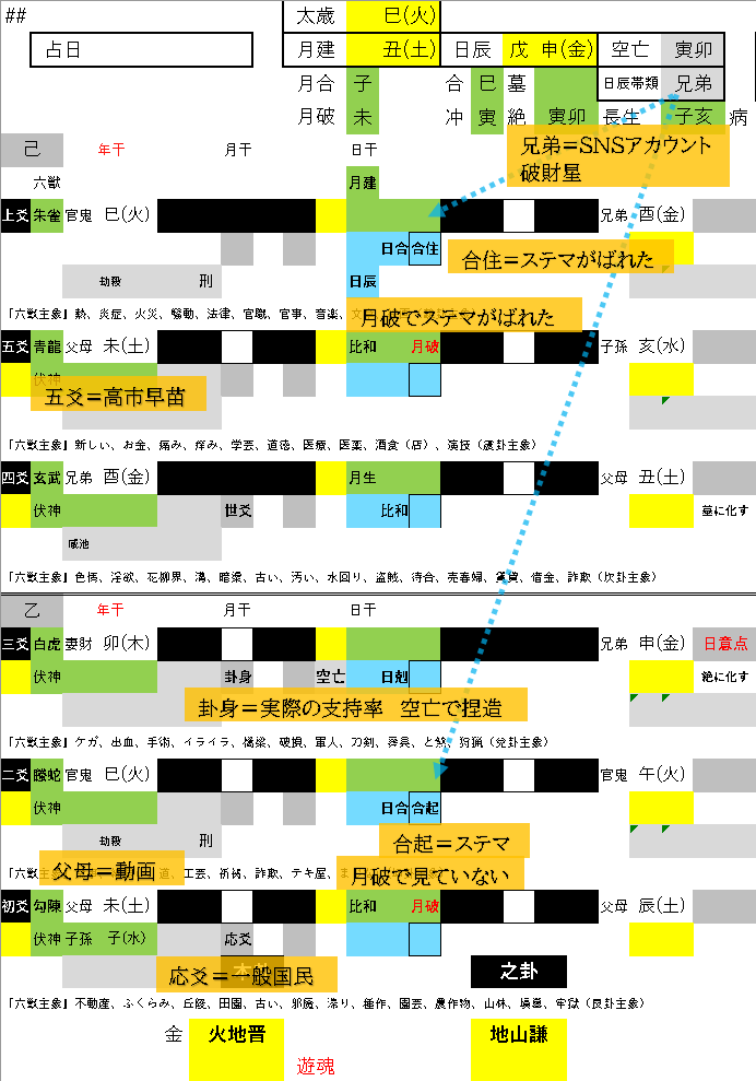 初爻の応爻が国民を意味します。父母を帯びるので中には見ている人もいるのですが、父母を生じるのが官鬼なので、国民が自発的、自然に動画視聴が拡散しているならば、ここでも官鬼が発動しなければ説明が付かない。