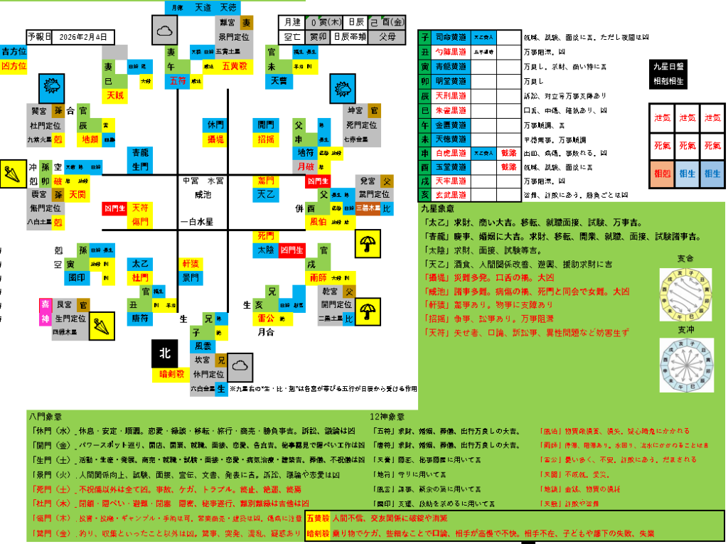 金運…やや凶。方位地支は官鬼と子孫を帯び四緑木星が同会します。ギャンブルは思わぬ勝利を収めることがありそうです。但し一時の勝利に目がくらんでのめりこみやすいので、辞め時、金額の上限を決めてから楽しむとよいでしょう、お買い物、勧誘、キャッチセールスに心がぐらつきます。財布のひもは固くを意識しましょう。