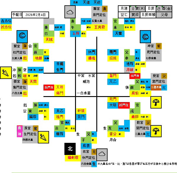 吉方位が南寄りに集中するため、効果的な方位除けが難しい一日です。南東🌤、南西🌤の吉運氣を取り入れてから吉刻を利用して移動するとよいでしょう。または滞在時間はなるべく早めに切り上げて、吉方位で運氣の回復を図りましょう