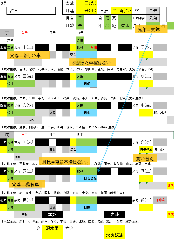 之卦は完成。今の車に乗り続ける、或いは思い切って買い替えを決断するともとることが出来ます。但し相談者は、まだ買い替えの車種を限定していませんから、前者の意味合いの方が強そうです。