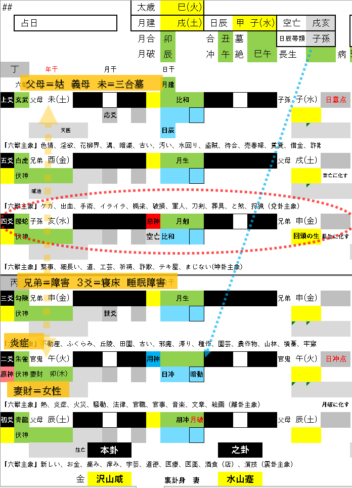 月建は過去と現況に作用、日辰は未来に作用するという原則から見れば、占った当日・現在は痛みがあるが、これは次第に引いていくという情報です。