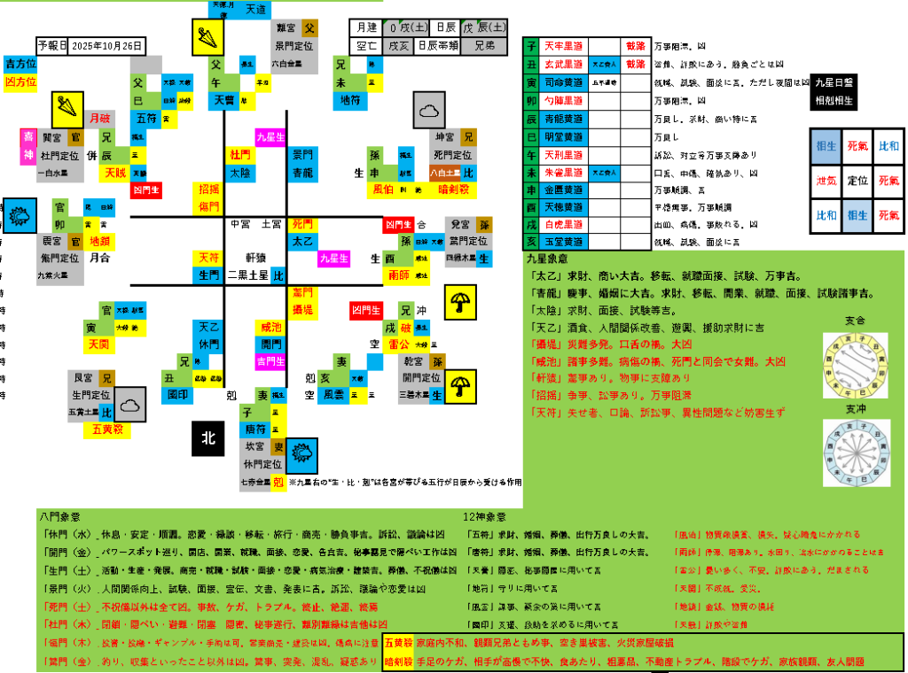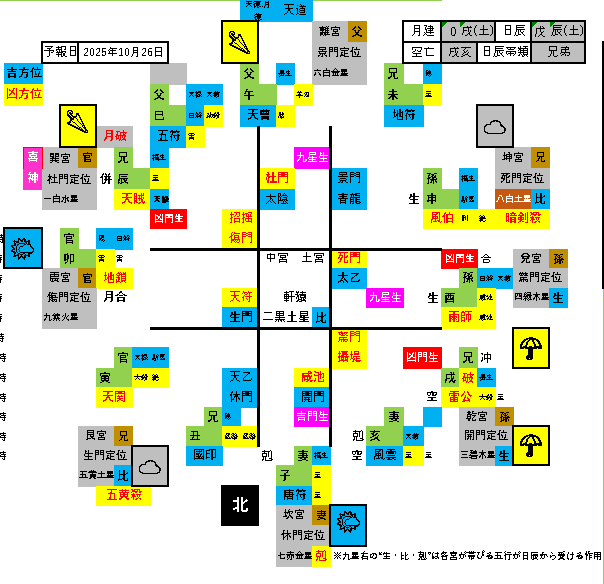 吉方位が北東方面に集中し、効果的な方位除けが難しい一日です。直接現地に歯向かわずに、北🌤又は東🌤の吉方位で、吉運氣を取り込んでから吉刻を利用して、現地に移動しましょう。特に西は凶意が強いので、滞在時間は短時間にとどめましょう。