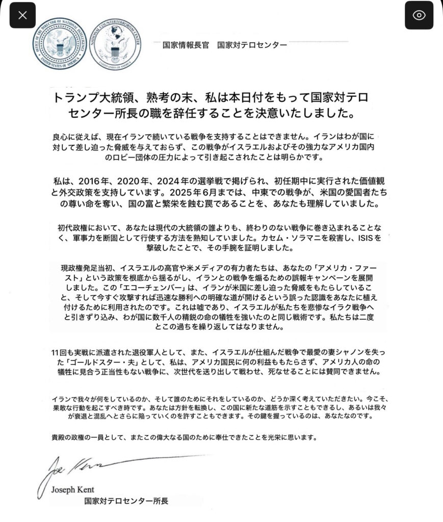 3月17日にはトランプ政権下で対テロ政策機関のトップ、国際テロ対策センターのジョセフ・ケント、センター長が辞任。辞任の理由は、イランに対する軍事作戦の発動が一般的に語られている「イランの核兵器保有に対する脅威」ではなく、「イスラエル及びアメリカ国内のロビイストによる開戦圧力」が真相で、その良心の呵責に耐えかねての辞任であることを文書で公表しています。