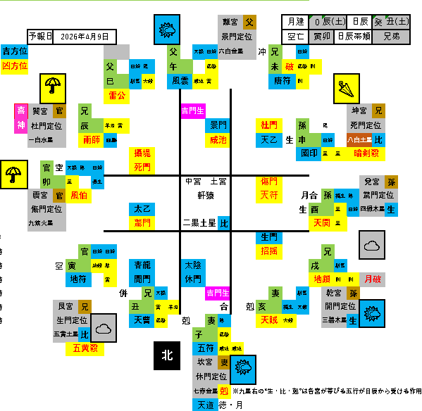 南西🌂…北西🌤に方位除けが可能です。吉方位に移動後、現地への移動が南⛅となるように調整して方位除けを行いましょう。南への移動はやや吉意が弱いので、吉刻を利用して移動するとよいでしょう。