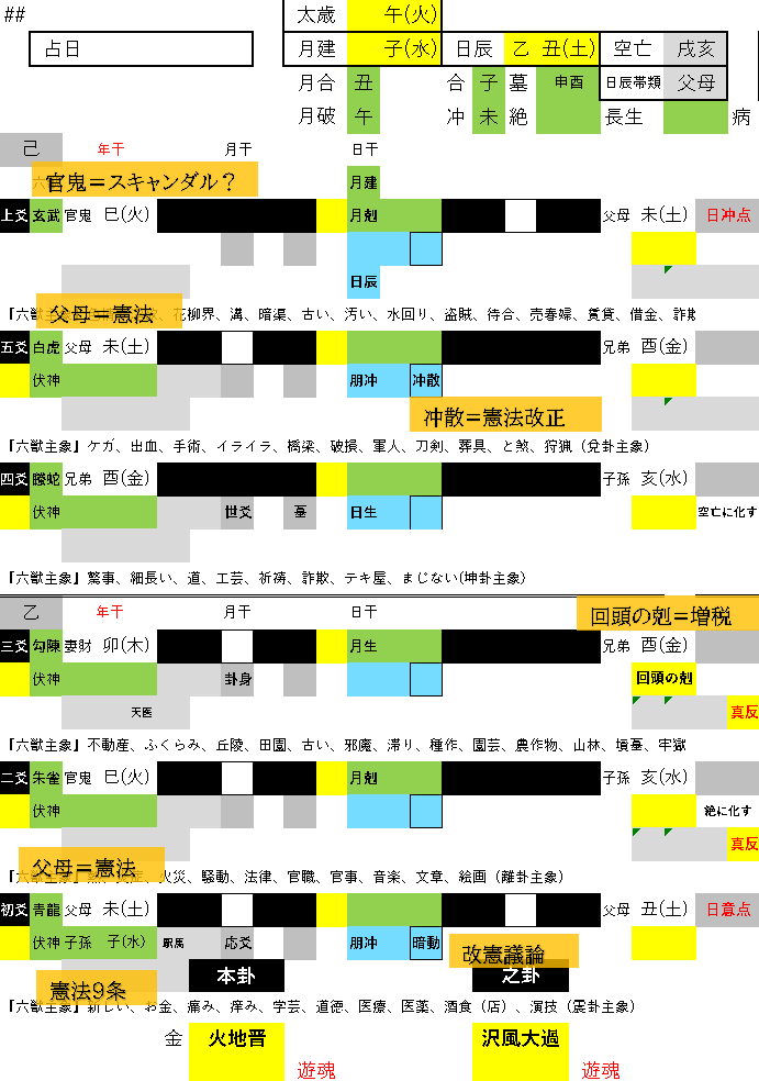 ただし上爻で官鬼(かんき)が発動します。年に二回も国政選挙は行わないでしょう。この官鬼はスキャンダルとみます。付帯玄武(げんぶ)は汚いと言う息があるので汚職、醜聞。この官鬼が五爻と同じ未(土)に変化していますから、総理周辺をめぐる醜聞、スキャンダルが発生しそうです。