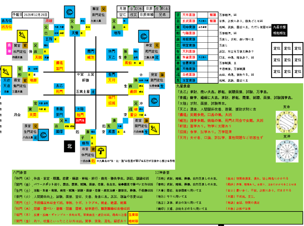 25日注意本命星は、五黄土星中宮日の為大きく崩れる本命星はありません。回座宮が日辰から剋を受ける一白水星はご注意ください。(お出かけの有無に関わらず凶事発生しやすい一日となります)