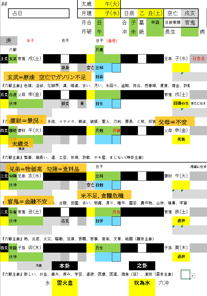 上爻に官鬼が付帯、官鬼は戦争で付帯玄武は黒という色の象意から原油を想起。この官鬼が空亡するので、中東危機で原油の輸入に制限がかかりガソリン価格が高騰しそうです