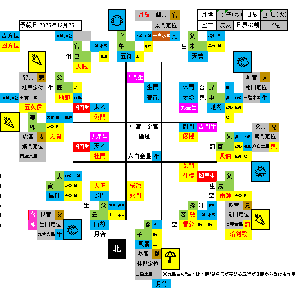 氣學・日盤及び時盤では、辰刻の北西、午刻の南東と北西、戌亥刻の南東に凶煞重なります。