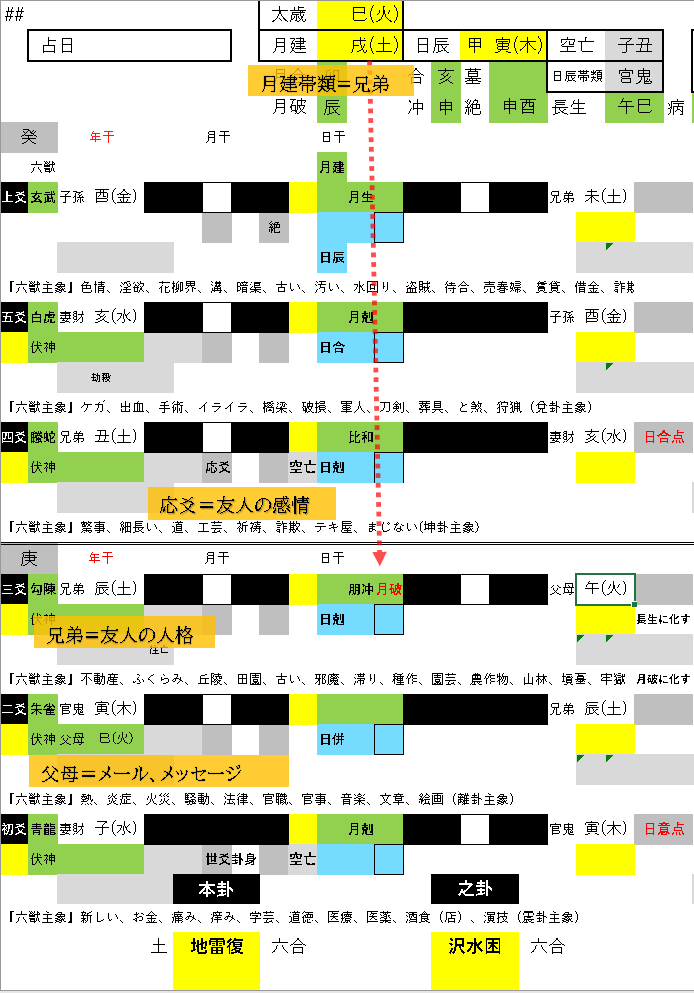 一方で応爻は兄弟を帯び、これは友人のMさんが親近感を持って相談者を見ている様子です。丑(土)の土行は月建に比和ですからMさんは相談者に好意的です。