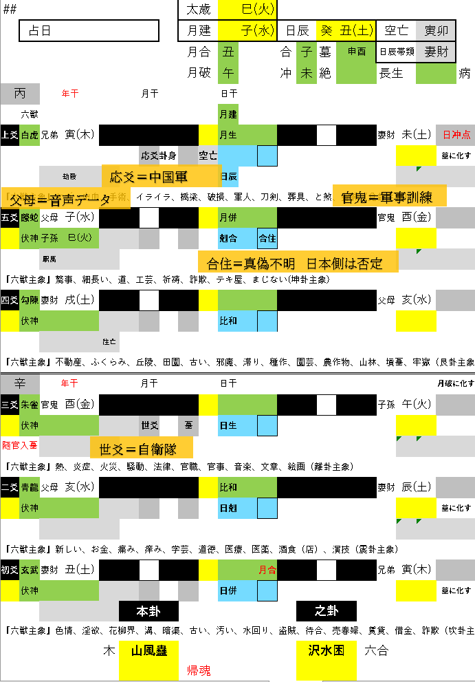 世爻は月破化、応爻は墓化していますから、双方の認識のズレがここまで事態を深刻化させているようですが、残念ながらこれも偶発的なやり取りではなく、以前からアメリカが計画している「台湾有事」を巡る計画の一環です。