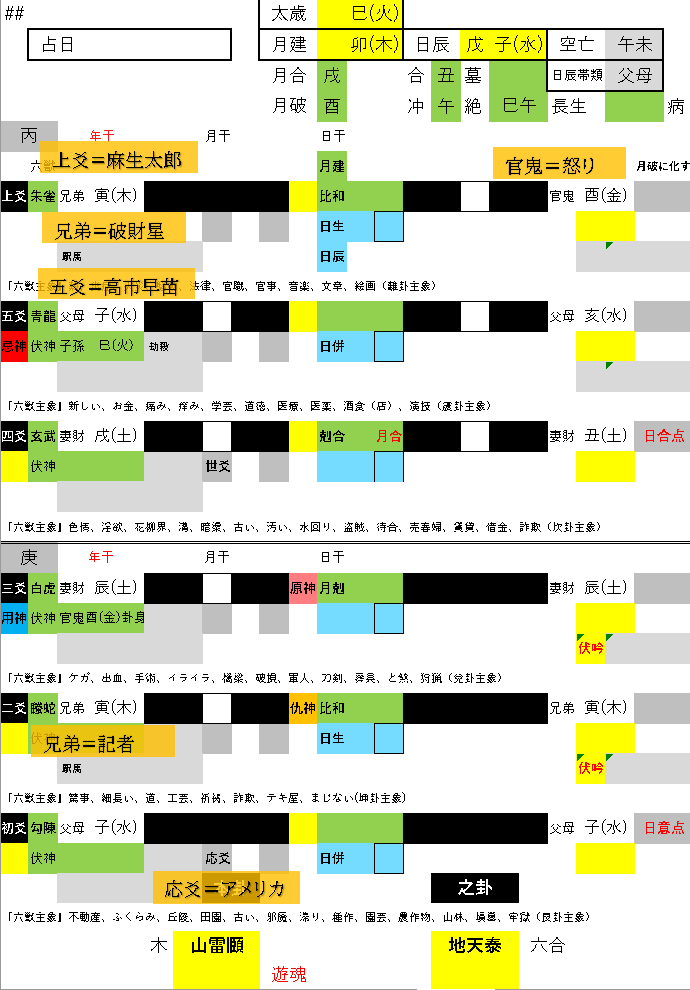 上爻を麻生太郎と見ると、確かに官鬼に変化していますから、そうりにいかりをぶつけたようすがあらわれています。上爻は兄弟を帯び、これは破財星ですから、戦争による国内経済の窮状を憂えたのかもしれません。
