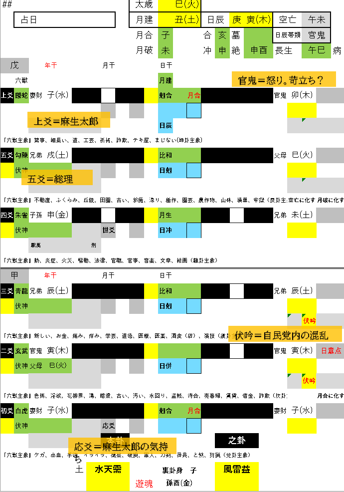 いずれにしても、衆院解散総選挙について聞かれた麻生太郎が「ないでしょうね」と即答してた心中には、「選挙はある」ということを知っていたうえで、周囲をけむに巻く発言、また一部報道の「激怒」という感情は易の卦象からは見て取ることができません。