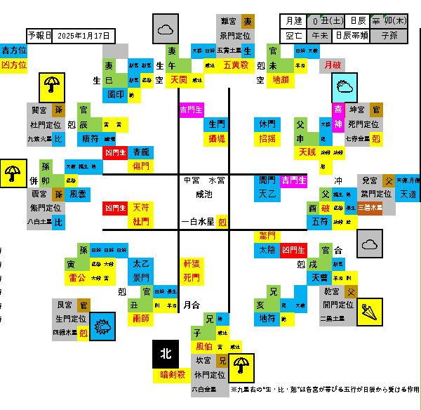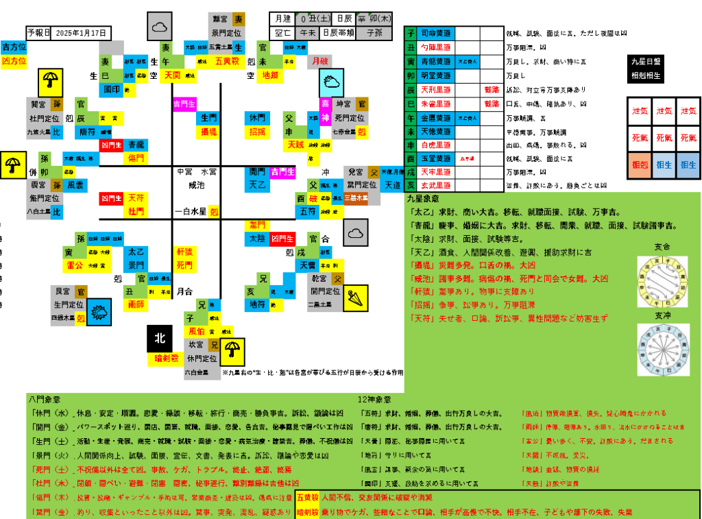 吉凶半々方位(生門旺相・五黄殺同会) お出かけした場合の方位事象…