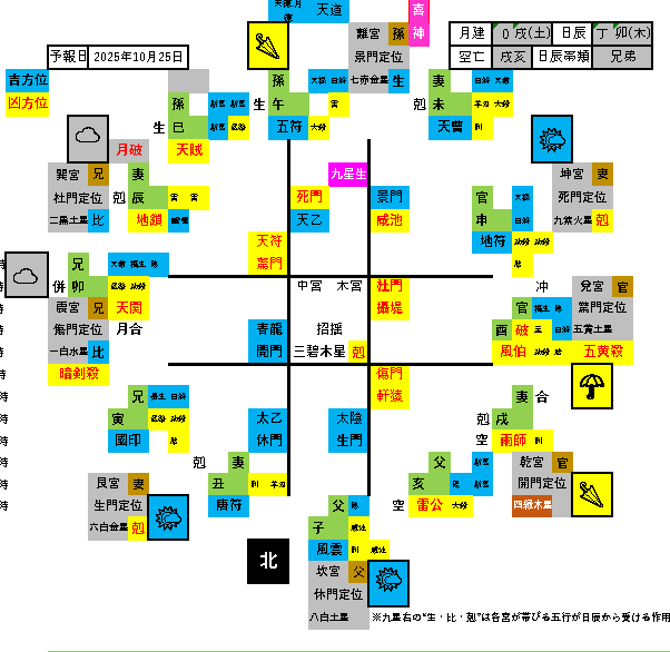 西☂️…南西🌤に方位除けが可能です。吉方位に移動後、現地への移動が北🌤となるように調整して方位除けを行うとよいでしょう。西は凶意が強いので、吉方位での滞在時間は長めに、また現地への移動は吉刻をご利用ください。