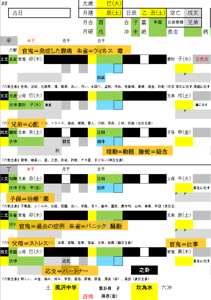 官鬼は玄武を付帯して回頭生ですから、しばらく症状が残りそうです。付帯玄武にはウィルス、細菌という意味があり、腹痛の原因はウィルス生の胃腸炎のようです。