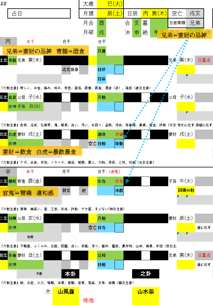 上爻の兄弟が日併、ここに青龍が付帯し青龍に飲酒の象意、兄弟は妻財(この場合飲酒、上爻なので晩酌)の忌神でこの場合断酒を意味します。