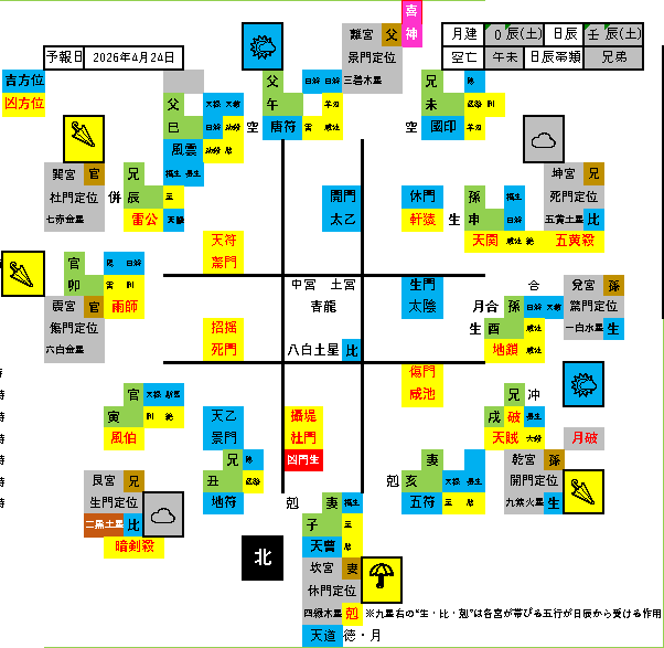 氣學・日盤及び時間盤では、寅刻の北東、南西、巳刻の西北、申刻の北東、亥刻の西北に凶煞重なります。