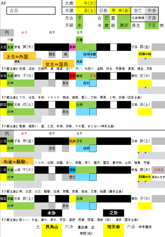 朱雀が付帯し騒動の象意、SNSで大炎上が続いている様子です。空亡していますから、NHKは「意図はなかった」と説明していますが、発動先は官鬼化出の回頭の生ですから、明確に悪意があります。